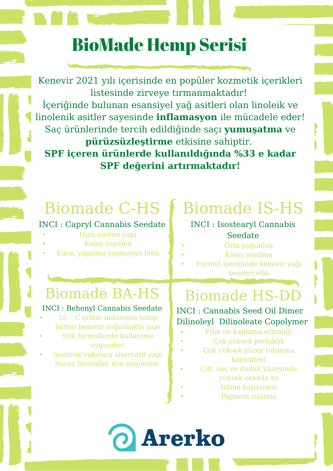 Kenevir 2021 yılı içerisinde en popüler kozmetik içerikleri listesinde zirveye tırmanmaktadır! İçeriğinde bulunan esansiyel yağ asitleri olan linoleik ve linolenik asitler sayesinde inflamasyon ile mücadele eder!